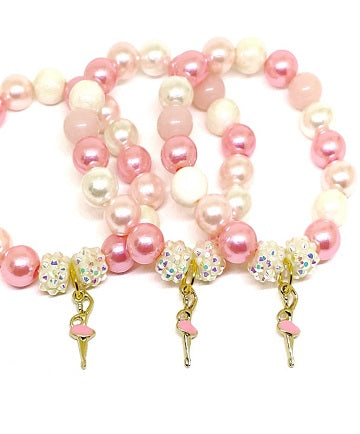 Pink, White and Gold Beaded Stretch Bracelet with Ballerina Charm
